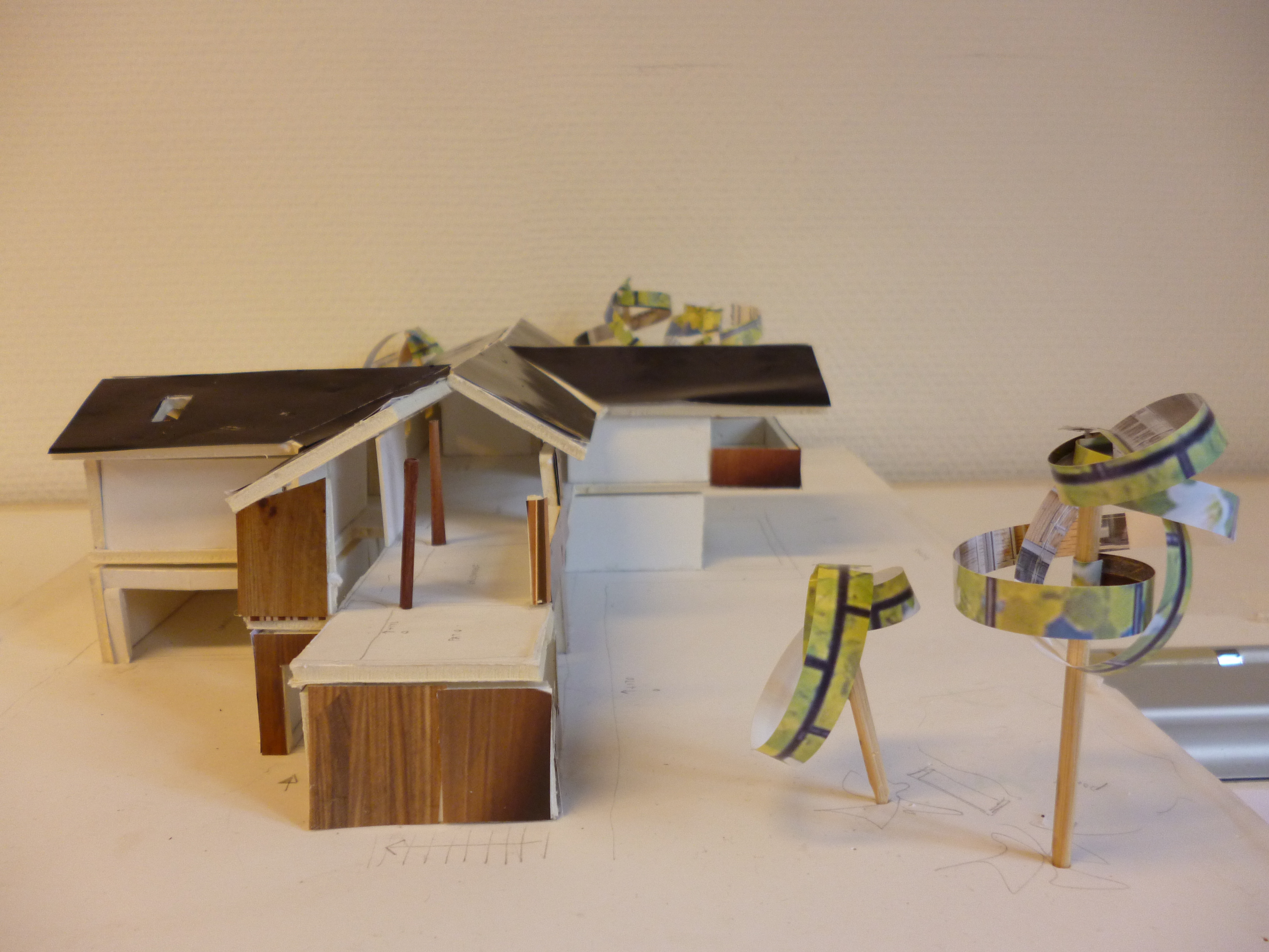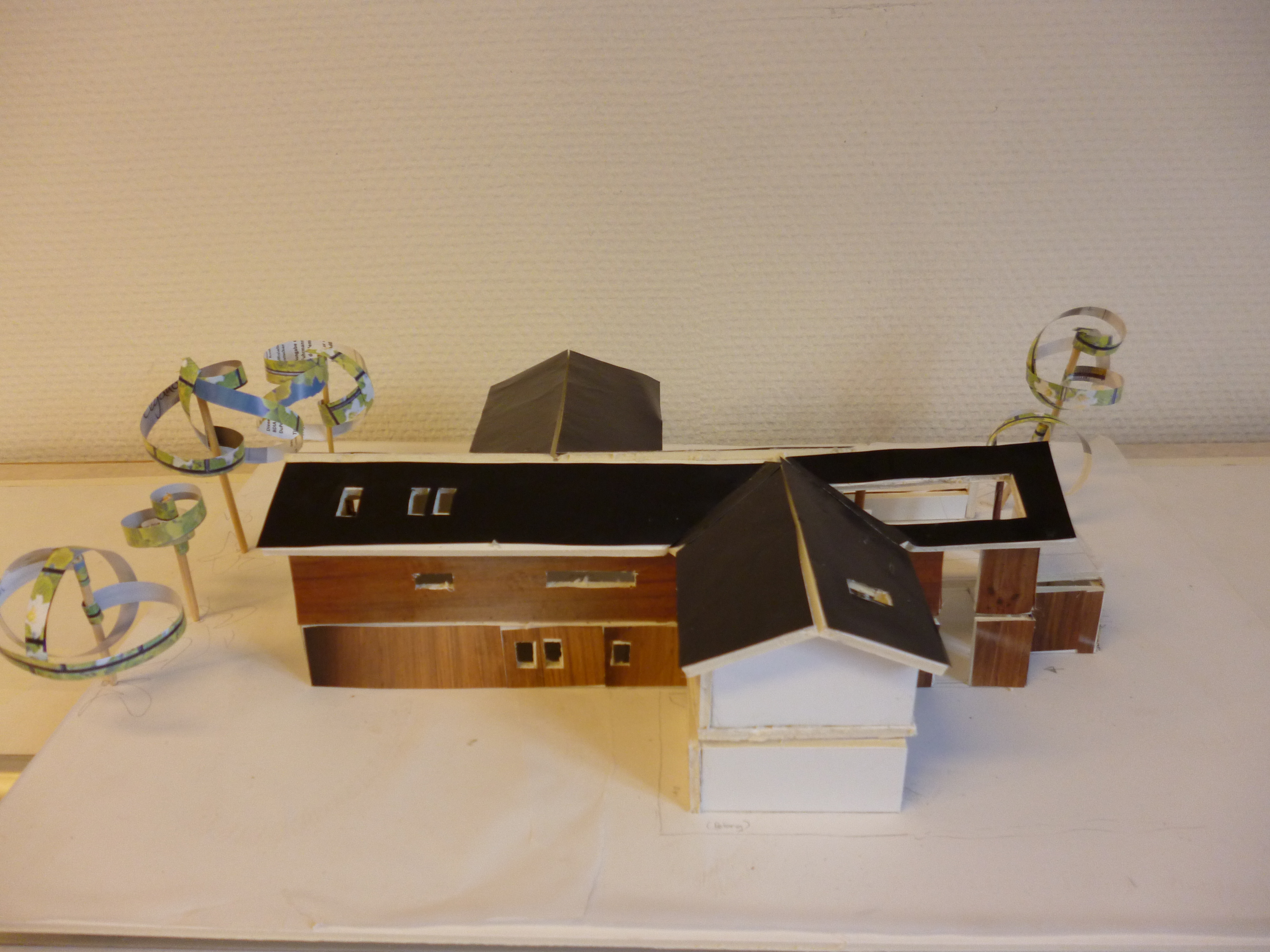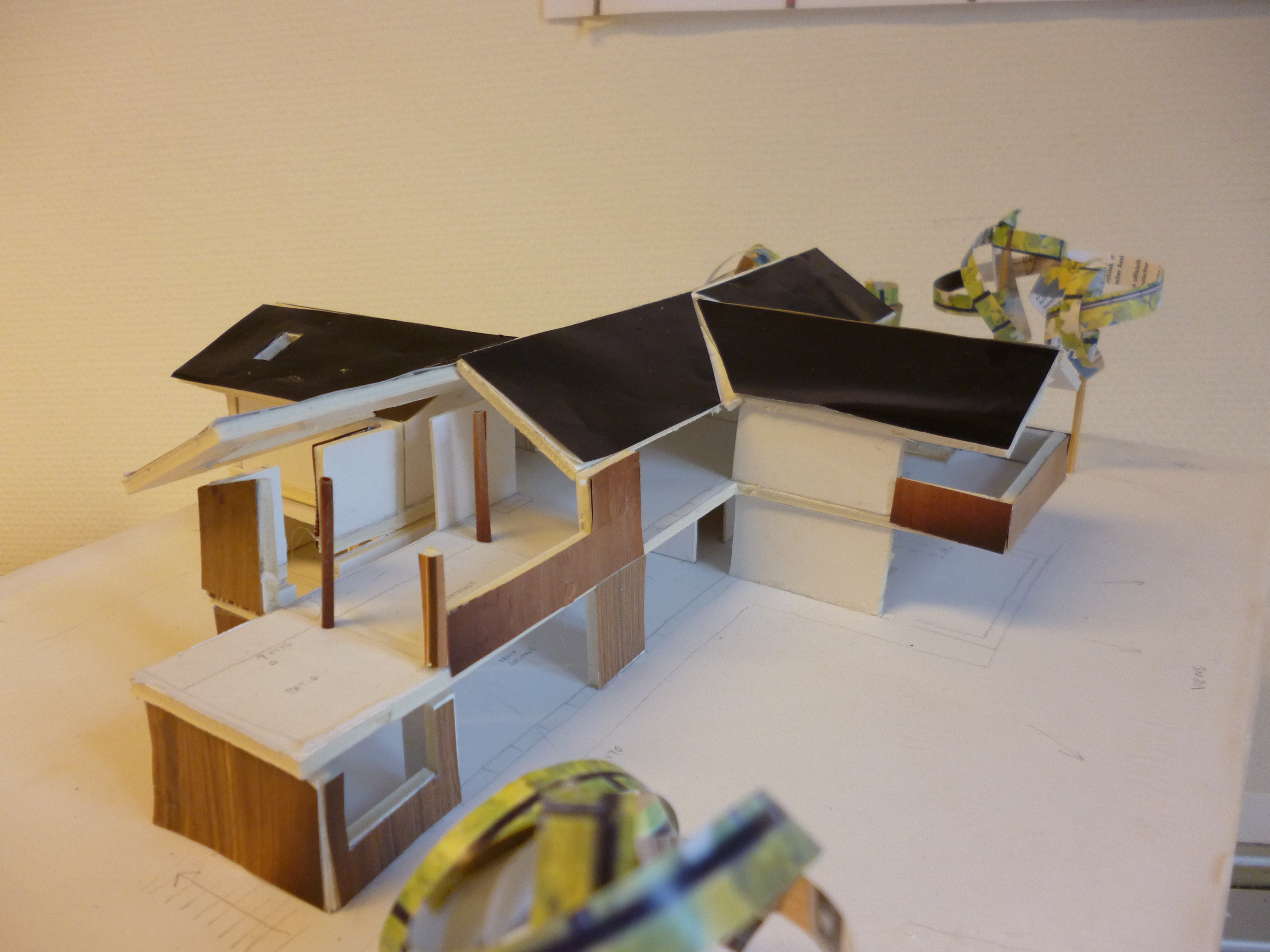 We were given a basic layout of an existing building and able to shift or remove certain interior walls as well as add elements and apply our own ideas to parts of the roof and upper level. I divided the building into specific zones, such as; inside/ outside, private/ public, work/ play, socialising and storage. Concentrating the bedrooms in one wing, meant that I could open up the middle of the house on each level for public space. I used the original lines of the building to elongate the space and make clean and easy traffic zones and connections between the inside and outside. Furthermore, widening the angle of the A-frame roof allowed more usable space on the upper level.