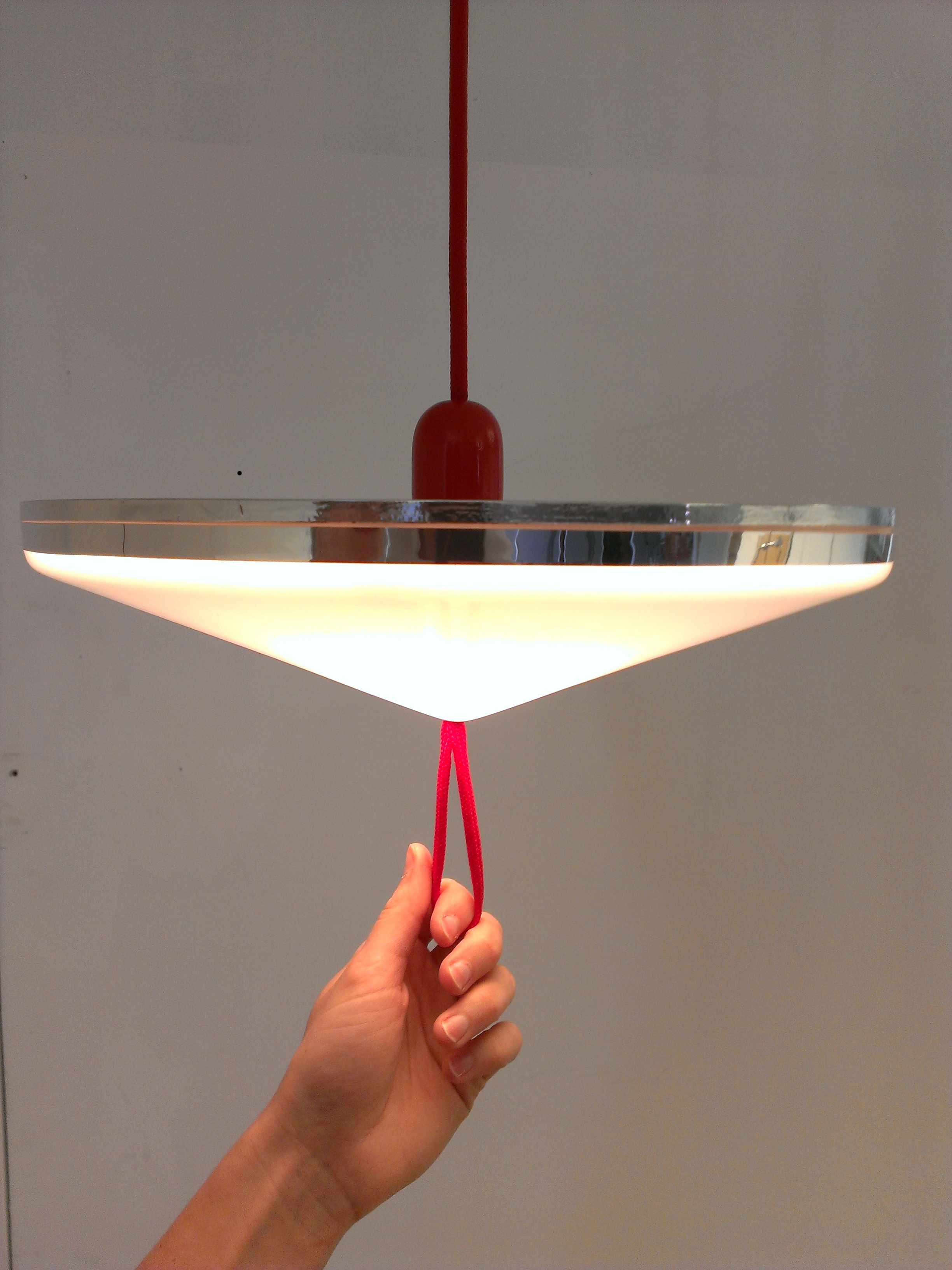 Top combines the contrasts of dawn and dusk. The lamp is dimmable and, using the (dimmer switch) handle, can be maneuvered to different heights for functional or more atmospheric light. The spinning top shape and flat top plane mean that it appears to float and alters the mood and space.