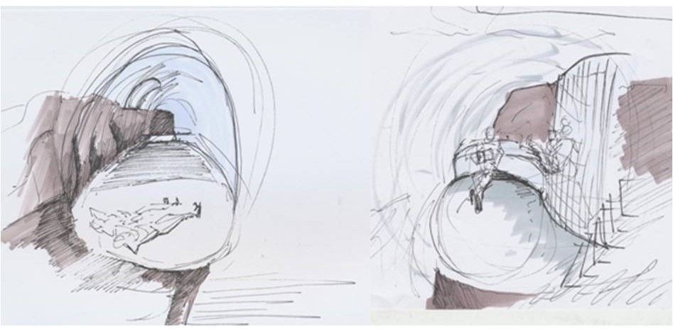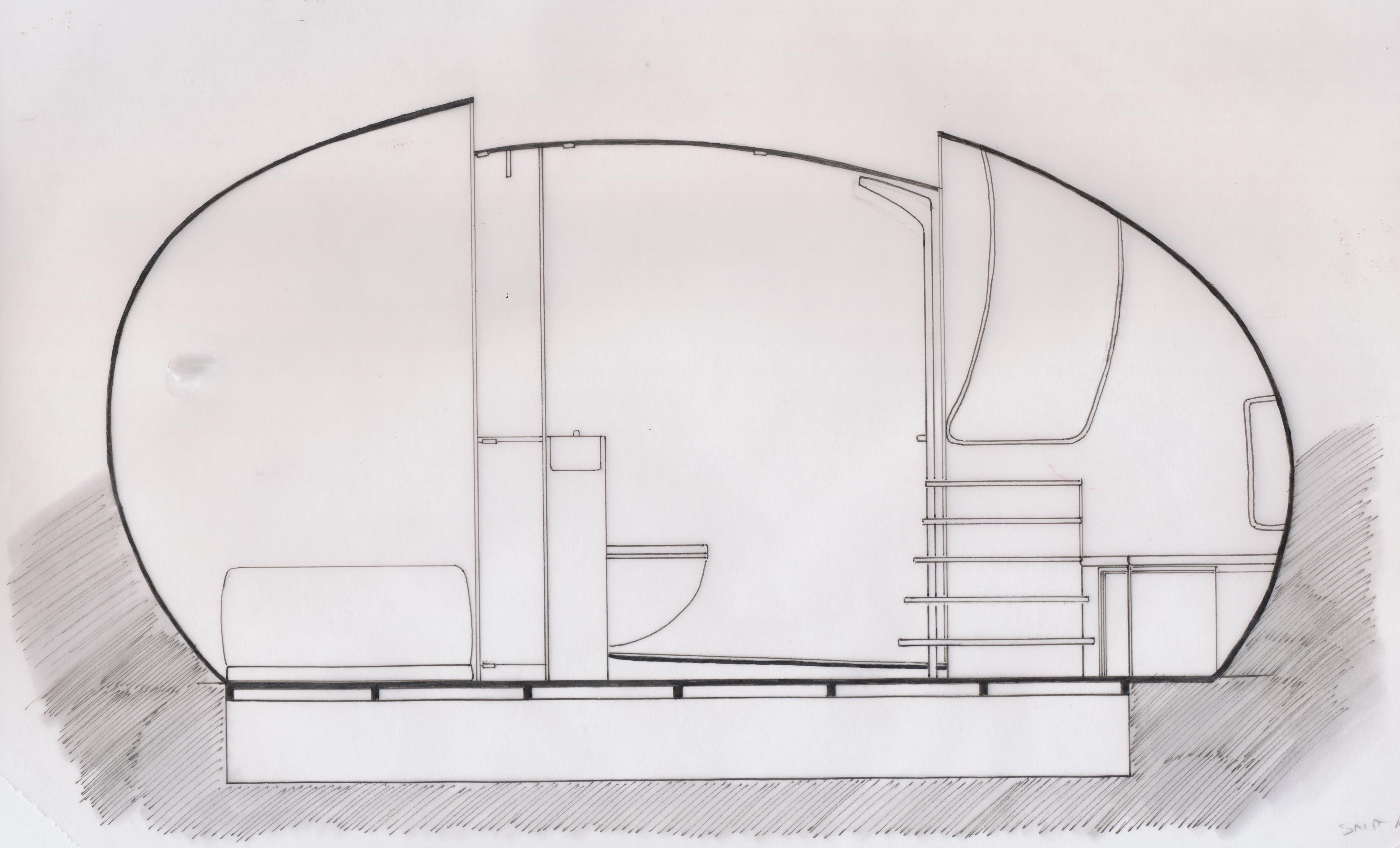 The pod is designed as an organic shape. The internal space is intimate, yet permeable to the outside. It provides a high standard of basic accommodation for two people for an overnight stay. Main areas: relax/ sleeping, storage and private ablutions. The external structure takes its inspiration from Ross Lovegrove’s Alpine capsule, and consists of two acrylic layers separated by gas insulation. The outside is in mirror finish, while it is completely transparent from the inside. The materials and shape reflect and transmit light, enabling the pod to blend in with its surroundings.