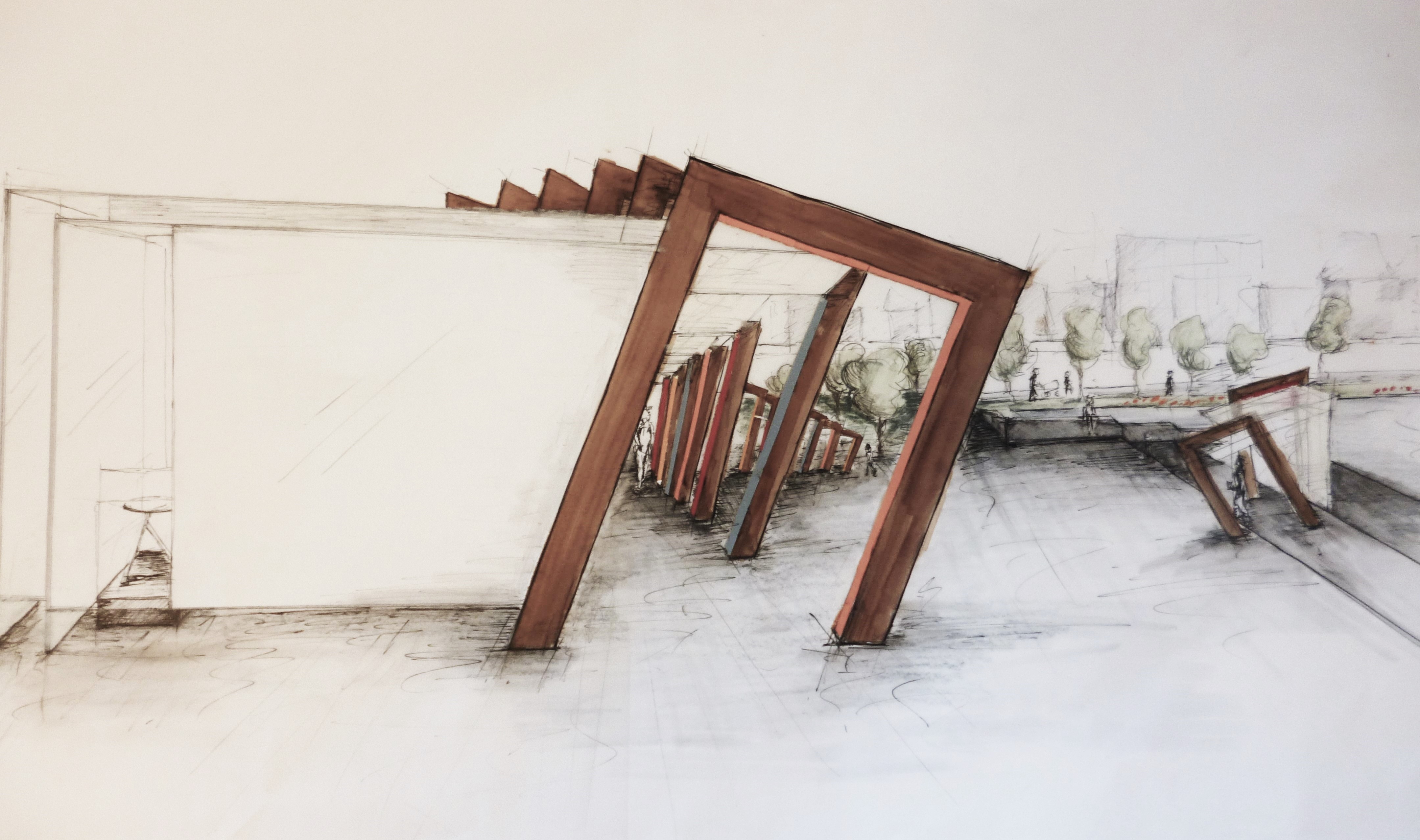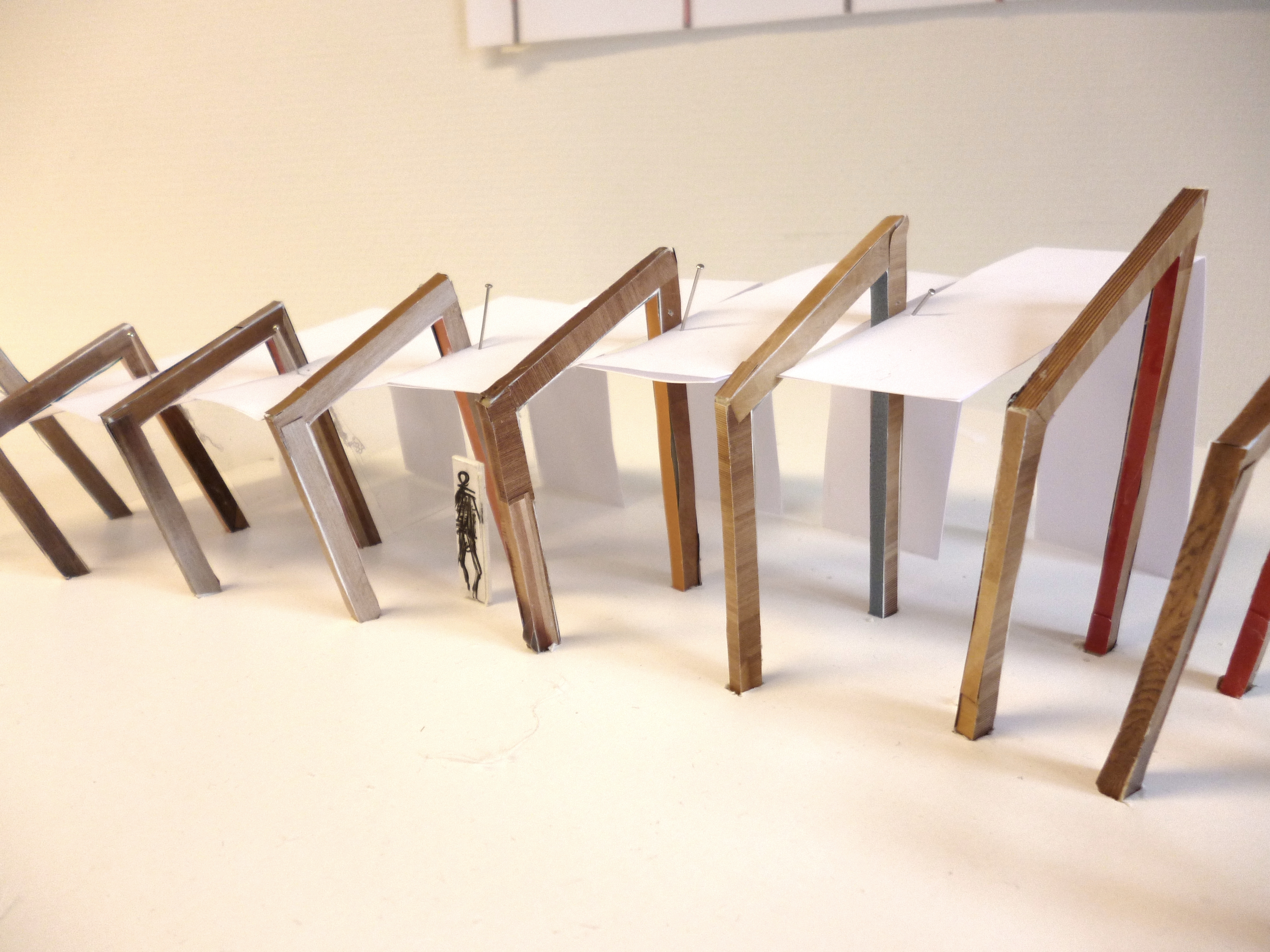 My design could be described as an outdoor corridor, with light-box exhibition spaces jutting off to one edge. The combination of the frames and shape somewhat resemble a fish bone. The ‘pods’ are connected, but can also stand individually, each one comprising of a slanted wooden frame and the opal glass light-box. Festplassen is a busy pedestrian through-fare and at night, the space remains open for viewing and motion sensor lighting in each pod delights and draws people to the space.